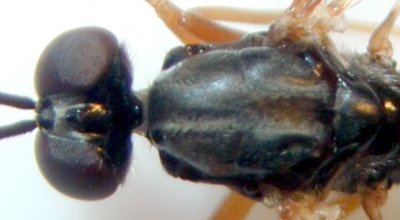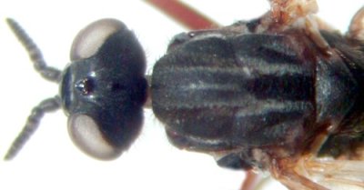 | Males: mesonotum finely sculpured, almost shining, with two inconspicuous stripes of golden hairs. [Fig. 82] Females: mesonotum with three pollinose stripes [Fig. 87] |